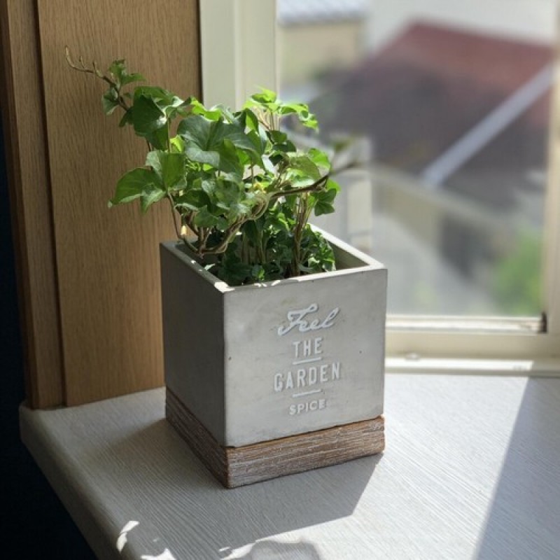 ■滑らかな質感のグレーポット本体と、木目のような加工を施したブラウンの受け皿をセットしたデザイン。